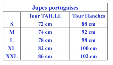 Attention : Les jupes espagnoles et portugaises sont donc faites selon la coupe traditionnelle , c’est-à-dire qu’elles remontent très haut au-dessus de la taille . Nous avons volontairement abandonné les appellations de tailles classiques ( S, M, L etc .. ) qui ne sont pas du tout adaptées à cette coupe .